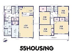 | 間取り | 3LDK 間取り内訳:リビングダイニングキッチン 18帖(1階)・洋室 7帖(2階)x3 |