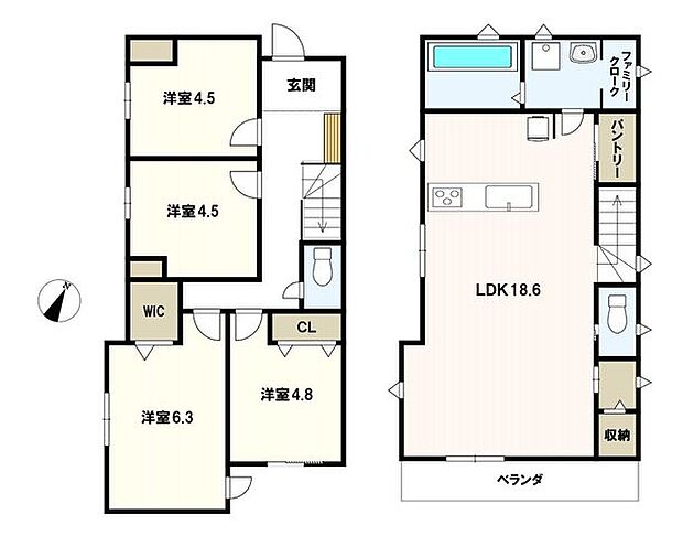 間取り内訳:洋室 6.3帖(1階)・洋室 4.8帖(1階)・洋室 4.5帖(1階)・洋室 4.5帖(1階)・リビングダイニングキッチン 18.6帖(2階)