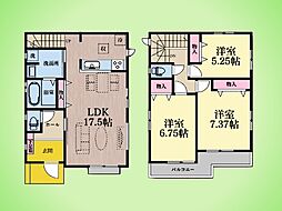 | 間取り | 3LDK 間取り内訳:リビングダイニングキッチン 17.5帖(1階)・洋室 7.3帖(2階)・洋室 6.7帖(2階)・洋室 5.2帖(2階) |