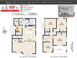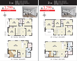 間取り内訳:リビングダイニングキッチン 26帖(1階)・洋室 6.3帖(2階)・洋室 5.7帖(2階)・洋室 5.7帖(2階)・洋室 4.5帖(2階)