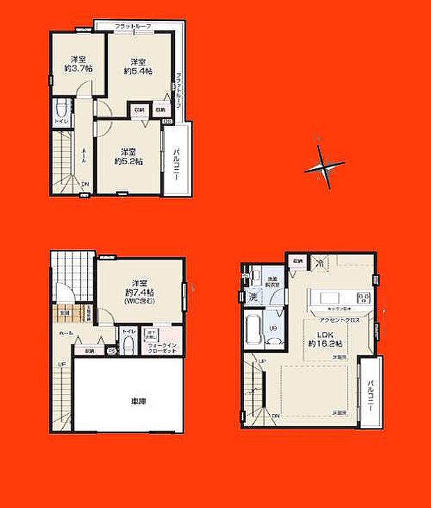間取り内訳:リビングダイニングキッチン 16.2帖(2階)・洋室 7.4帖(1階)・洋室 5.4帖(3階)・洋室 5.2帖(3階)・洋室 3.7帖(3階)