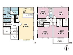 | 間取り | 3LDK(WIC シューズクローク パントリー ファミリークローク) 間取り内訳:リビングダイニングキッチン 17帖(1階)・洋室 6.3帖(2階)・洋室 6帖(2階)x2 |