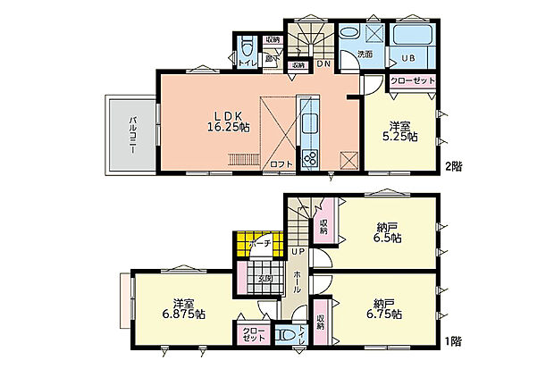 間取り内訳:洋室 6.8帖(1階)・収納 6.7帖(1階)・収納 6.5帖(1階)・リビングダイニングキッチン 16.2帖(2階)・洋室 5.2帖(2階)