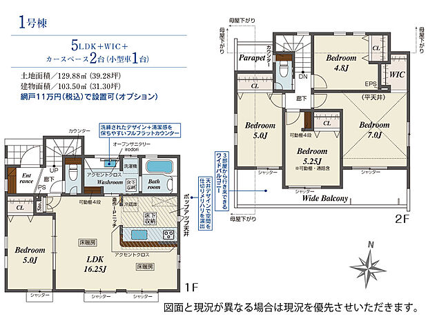 - 「建築条件付き土地」の「建物プラン例」は、土地購入者の設計プランの一例であり、プランの採用可否は任意です。