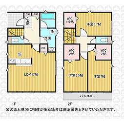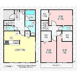 | 間取り | 3LDK 間取り内訳:リビングダイニングキッチン 17帖(1階)・洋室 6.5帖(2階)・洋室 6.7帖(2階)・洋室 7帖(2階) |
