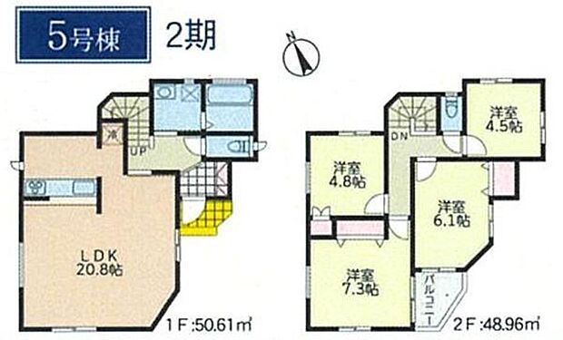 | 間取り | 4LDK 間取り内訳:リビングダイニングキッチン 20.8帖(1階)・洋室 7.3帖(2階)・洋室 6.1帖(2階)・洋室 4.8帖(2階)・洋室 4.5帖(2階) |