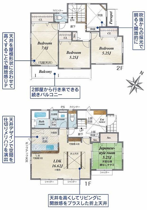 全居室南東向きに加え、ワイドバルコニー付きで通風・陽当たり良好な間取り!玄関には吹抜天井を採用で明る