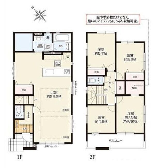 | 間取り | 4LDK 間取り内訳:リビングダイニングキッチン 22.2帖(1階)・洋室 5.7帖(2階)・洋室 5.2帖(2階)・洋室 7.5帖(2階)・洋室 4.5帖(2階) |