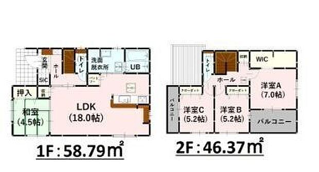 | 間取り | 4LDK 間取り内訳:リビングダイニングキッチン 18帖(1階)・和室 4.5畳(1階)・洋室 7帖(2階)・洋室 5.2帖(2階)・洋室 5.2帖(2階) |
