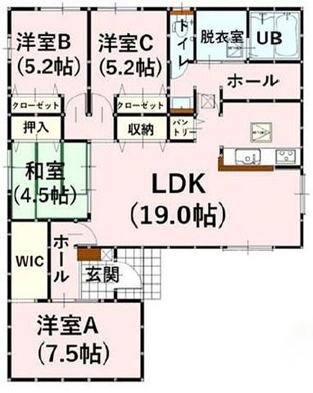 間取り内訳:リビングダイニングキッチン 19帖(1階)・洋室 5.2帖(1階)・洋室 5.2帖(1階)・洋室 7.5帖(1階)・和室 4.5畳(1階)