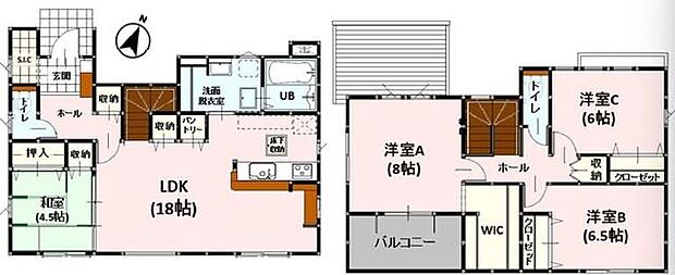 | 間取り | 4LDK 間取り内訳:リビングダイニングキッチン 18帖(1階)・和室 4.5畳(1階)・洋室 8帖(2階)・洋室 6帖(2階)・洋室 6.5帖(2階) |