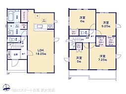 間取り内訳:リビングダイニングキッチン 18.2帖(1階)・洋室 7.2帖(2階)・洋室 6帖(2階)・洋室 5.2帖(2階)・洋室 5帖(2階)