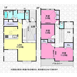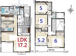 間取り内訳:リビングダイニングキッチン 17.2帖(1階)・洋室 5帖(2階)・洋室 5帖(2階)・洋室 11.2帖(2階)