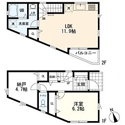 | 間取り | 1SLDK 間取り内訳:洋室 6.2帖(1階)・収納 4.7帖(1階)・リビングダイニングキッチン 11.9帖(2階) |