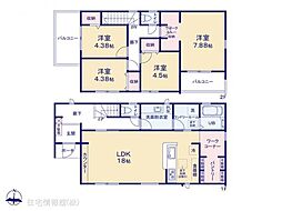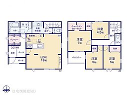 | 間取り | 4LDK 間取り内訳:リビングダイニングキッチン 18帖(1階)・洋室 7帖(2階)・洋室 5帖(2階)・洋室 5帖(2階)・洋室 4.5帖(2階) |