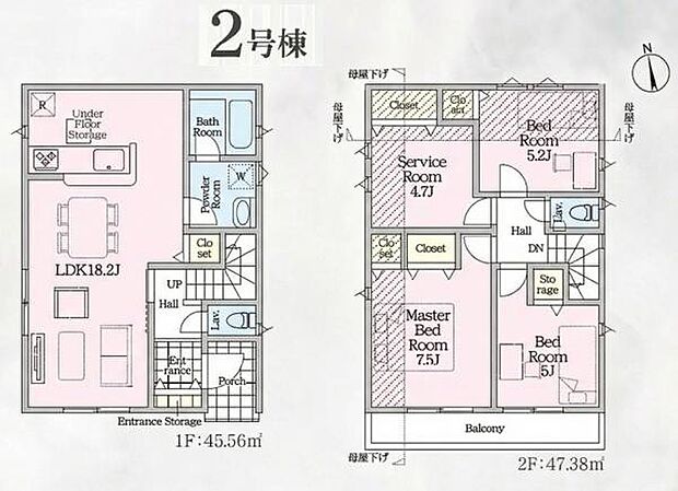間取り内訳:リビングダイニングキッチン 18.2帖(1階)・洋室 7.5帖(2階)・洋室 5.2帖(2階)・洋室 5帖(2階)・収納 4.7帖(2階)