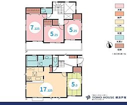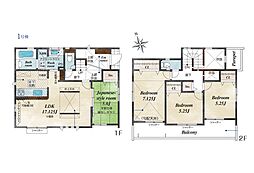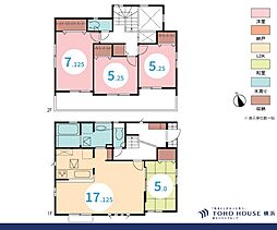 | 間取り | 4LDK 間取り内訳:リビングダイニングキッチン 17帖(1階)・洋室 5.2帖(1階)・洋室 7帖(2階)・洋室 6帖(2階)・洋室 6帖(2階) |