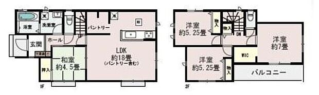 | 間取り | 4LDK 間取り内訳:リビングダイニングキッチン 18帖(1階)・和室 4.5畳(1階)・洋室 7帖(2階)・洋室 5.2帖(2階)・洋室 5.2帖(2階) |