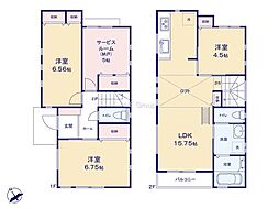 | 間取り | 3SLDK 間取り内訳:洋室 6.7帖(1階)・洋室 6.5帖(1階)・収納 5帖(1階)・リビングダイニングキッチン 15.7帖(2階)・洋室 4.5帖(2階) |