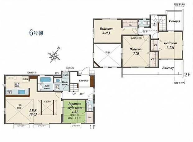 | 間取り | 4LDK 間取り内訳:リビングダイニングキッチン 18帖(1階)・和室 4.5畳(1階)・洋室 7帖(2階)・洋室 5.2帖(2階)・洋室 5.2帖(2階) |