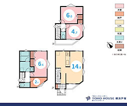 間取り内訳:洋室 6帖(1階)・リビングダイニングキッチン 14.5帖(2階)・洋室 8帖(3階)・洋室 4.8帖(3階)