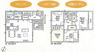 間取り内訳:リビングダイニングキッチン 17.8帖(1階)・洋室 7.2帖(2階)・洋室 5.2帖(2階)x2・収納 5帖(2階)