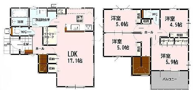 | 間取り | 4LDK 間取り内訳:リビングダイニングキッチン 17.1帖(1階)・洋室 5帖(2階)・洋室 5帖(2階)・洋室 4.5帖(2階)・洋室 5.9帖(2階) |