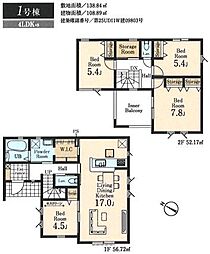 間取り内訳:リビングダイニングキッチン 17帖(1階)・洋室 4.5帖(1階)・洋室 5.4帖(2階)・洋室 5.4帖(2階)・洋室 7.8帖(2階)・収納(2階)