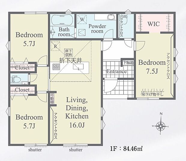 敷地はゆとりの55坪 生活動線が整った暮らしやすい平屋のお住まいです。折上天井の開放感溢れるLDKは16帖。可動棚のついた収納スペースやアクセントクロスも採用されています。WICも備わった全室2面採光