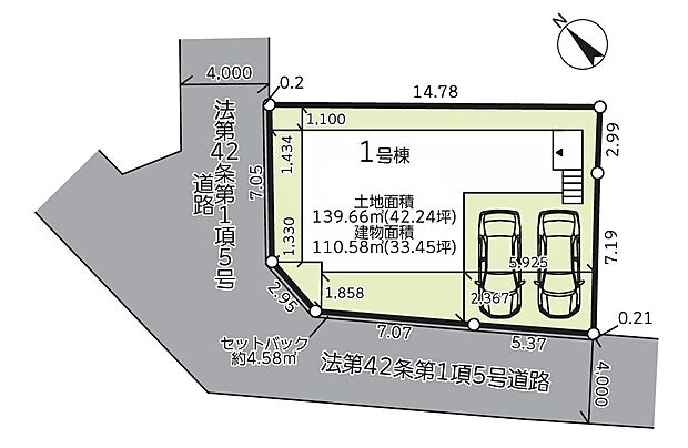 敷地面積は広々42坪以上 南西角地で陽当りも良く開放的な好立地です。お車並列2台分の駐車場もご用意。