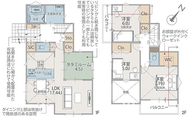 上部吹抜のLDKは広々17帖 WICやSICなど充実の収納スペースもご用意。2ヶ所にバルコニー採用