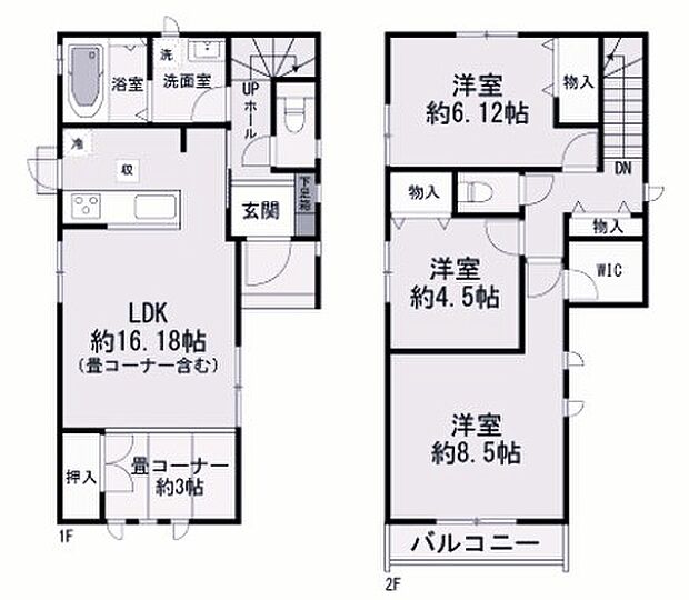 | 間取り | 4LDK 間取り内訳:リビングダイニングキッチン 16.1帖(1階)・和室 3畳(1階)・洋室 4.5帖(2階)・洋室 6.1帖(2階)・洋室 8.5帖(2階) |