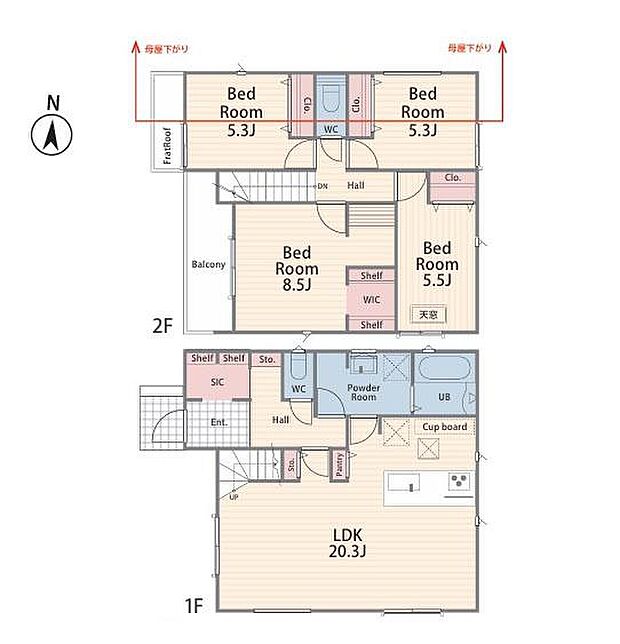 | 間取り | 4LDK 間取り内訳:リビングダイニングキッチン 20.3帖(1階)・洋室 5.3帖(2階)・洋室 8.5帖(2階)・洋室 5.5帖(2階)・洋室 5.3帖(2階) |