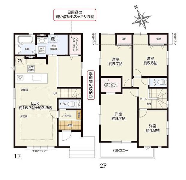 間取り内訳:リビングダイニングキッチン 20帖(1階)・洋室 9.7帖(2階)・洋室 4.8帖(2階)・洋室 5.6帖(2階)・洋室 5.7帖(2階)