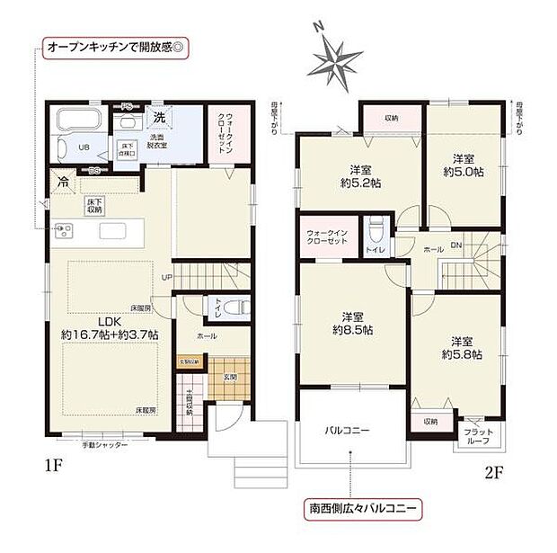 | 間取り | 4LDK 間取り内訳:リビングダイニングキッチン 20.4帖(1階)・洋室 8.5帖(2階)・洋室 5.8帖(2階)・洋室 5帖(2階)・洋室 5.2帖(2階) |