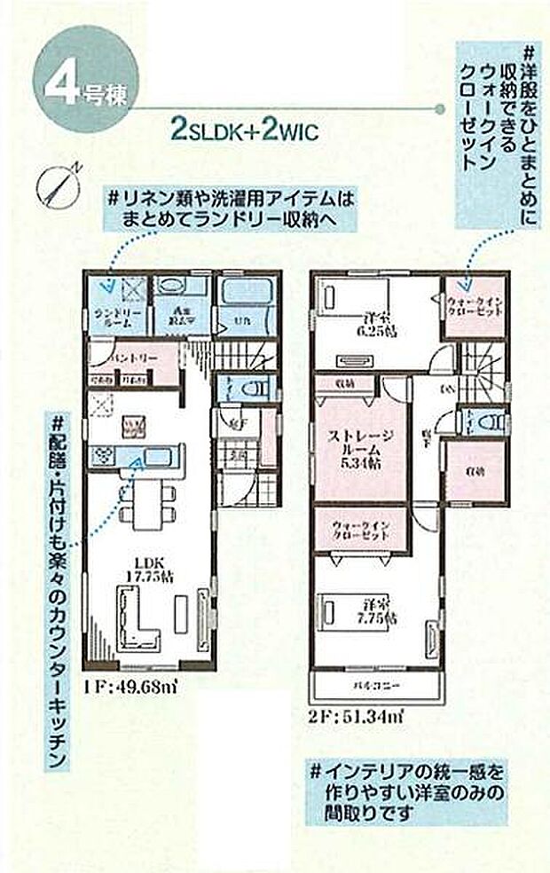 | 間取り | 2SLDK 間取り内訳:リビングダイニングキッチン 17.7帖(1階)・洋室 7.7帖(2階)・洋室 6.2帖(2階)・収納 5.3帖(2階) |