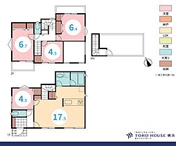 | 間取り | 4LDK 間取り内訳:リビングダイニングキッチン 17.5帖(1階)・洋室 4.5帖(1階)・洋室 6.7帖(2階)・洋室 6.4帖(2階)・洋室 4.5帖(2階) |