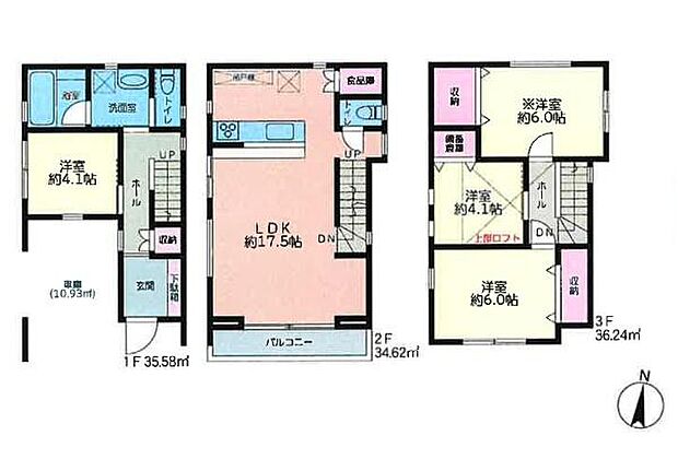 間取り内訳:洋室 4.1帖(1階)・リビングダイニングキッチン 17.5帖(2階)・洋室 6帖(3階)・洋室 4.1帖(3階)・収納 6帖(3階)