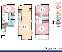 間取り内訳:洋室 4.7帖(1階)・リビングダイニングキッチン 18.1帖(2階)・洋室 7帖(3階)・洋室 5.8帖(3階)