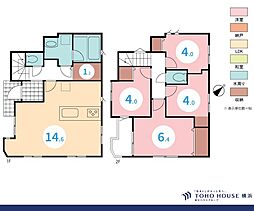 | 間取り | 4LDK 間取り内訳:リビングダイニングキッチン 14.6帖(1階)・洋室 6.4帖(2階)・洋室 4帖(2階)・洋室 4帖(2階)・洋室 4帖(2階) |