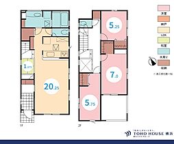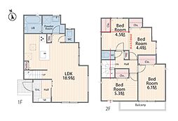 間取り内訳:リビングダイニングキッチン 18帖(1階)・洋室 6.8帖(2階)・洋室 6帖(2階)・洋室 5.2帖(2階)