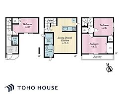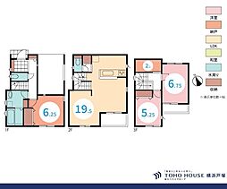 | 間取り | 2SLDK 間取り内訳:収納 5.8帖(1階)・リビングダイニングキッチン 18.4帖(2階)・洋室 6.5帖(3階)・洋室 6.4帖(3階)・収納 4.6帖(3階) |