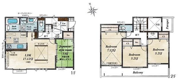 | 間取り | 4LDK 間取り内訳:リビングダイニングキッチン 17.1帖(1階)・和室 5畳(1階)・洋室 7.1帖(2階)・洋室 5.2帖(2階)・洋室 5.2帖(2階) |