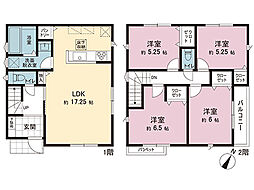| 間取り | 3LDK 間取り内訳:洋室 6.5帖(1階)・洋室 6帖(1階)・リビングダイニングキッチン 17.5帖(2階)・洋室 4.5帖(2階) |