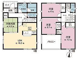 間取り内訳:リビングダイニングキッチン 16.2帖(1階)・和室 4.5畳(1階)・洋室 7.2帖(2階)・洋室 5.7帖(2階)・洋室 6帖(2階)