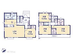 間取り内訳:リビングダイニングキッチン 17帖(1階)・洋室 5.2帖(1階)・洋室 7.5帖(2階)・洋室 6帖(2階)・洋室 5.2帖(2階)