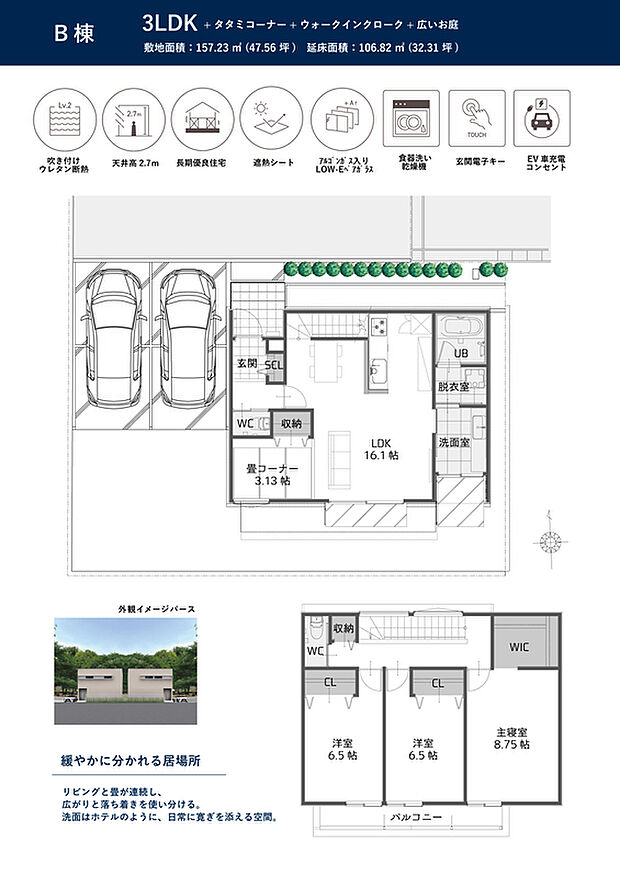 | 建物面積 | A棟:108.48m2・B棟:106.82m2 | ||