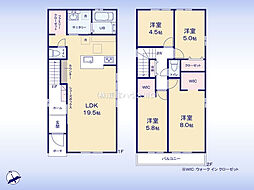 | 間取り | 4LDK 間取り内訳:リビングダイニングキッチン 19.5帖(1階)・洋室 8帖(2階)・洋室 5.8帖(2階)・洋室 5帖(2階)・洋室 4.5帖(2階) |