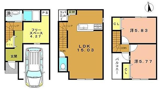 フリープラン 南向きにつき日当たり良好 全面棟無し 2WAYアクセス建物プラン LDK約15.03坪