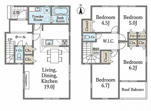 | 間取り | 4LDK 間取り内訳:リビングダイニングキッチン 19帖(1階)・洋室 4.5帖(2階)・洋室 5帖(2階)・洋室 6.2帖(2階)・洋室 6.7帖(2階) |